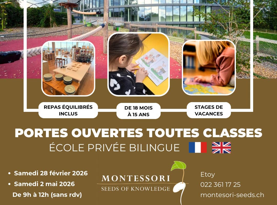 Montessori Seeds of Knowledge est un établissement privé, localisé depuis 2021 à Etoy, entre Genève et Lausanne, en Suisse. Notre école offre depuis plus d’une décennie une expérience éducative exceptionnelle. Avec une approche unique, personnalisée et entièrement bilingue (anglais-français) utilisant les principes de la méthode Montessori, les enfants âgés de 18 mois à 15 ans évoluent dans un environnement propice à leur développement physique, émotionnel et intellectuel, émotionnel et intellectuel.